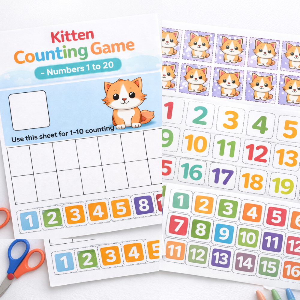 This printable counting game includes two counting boards (1β10 and 1β20 versions) along with separate number cards and kitten cut-out pieces. Simply print, cut, and play!